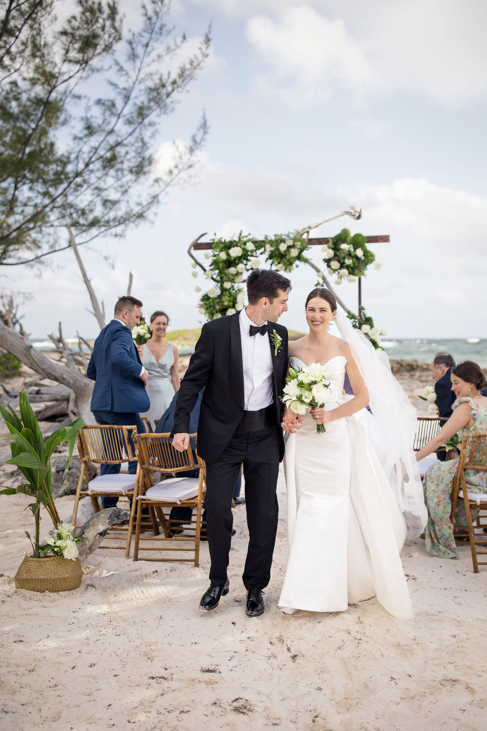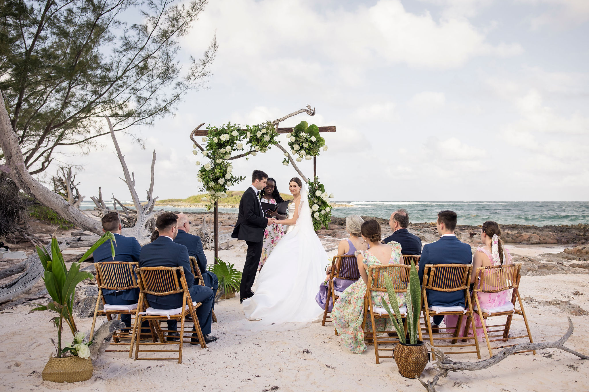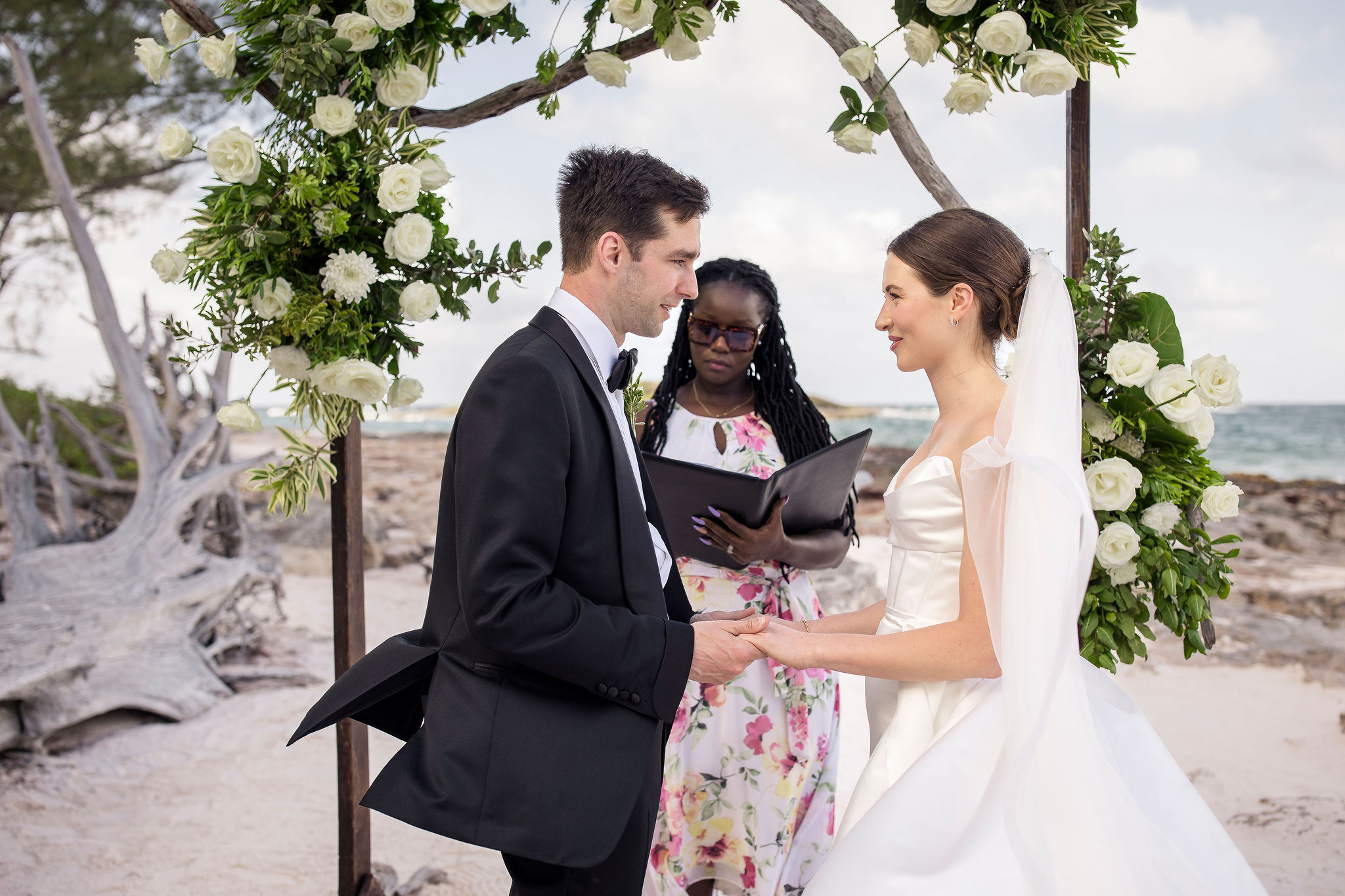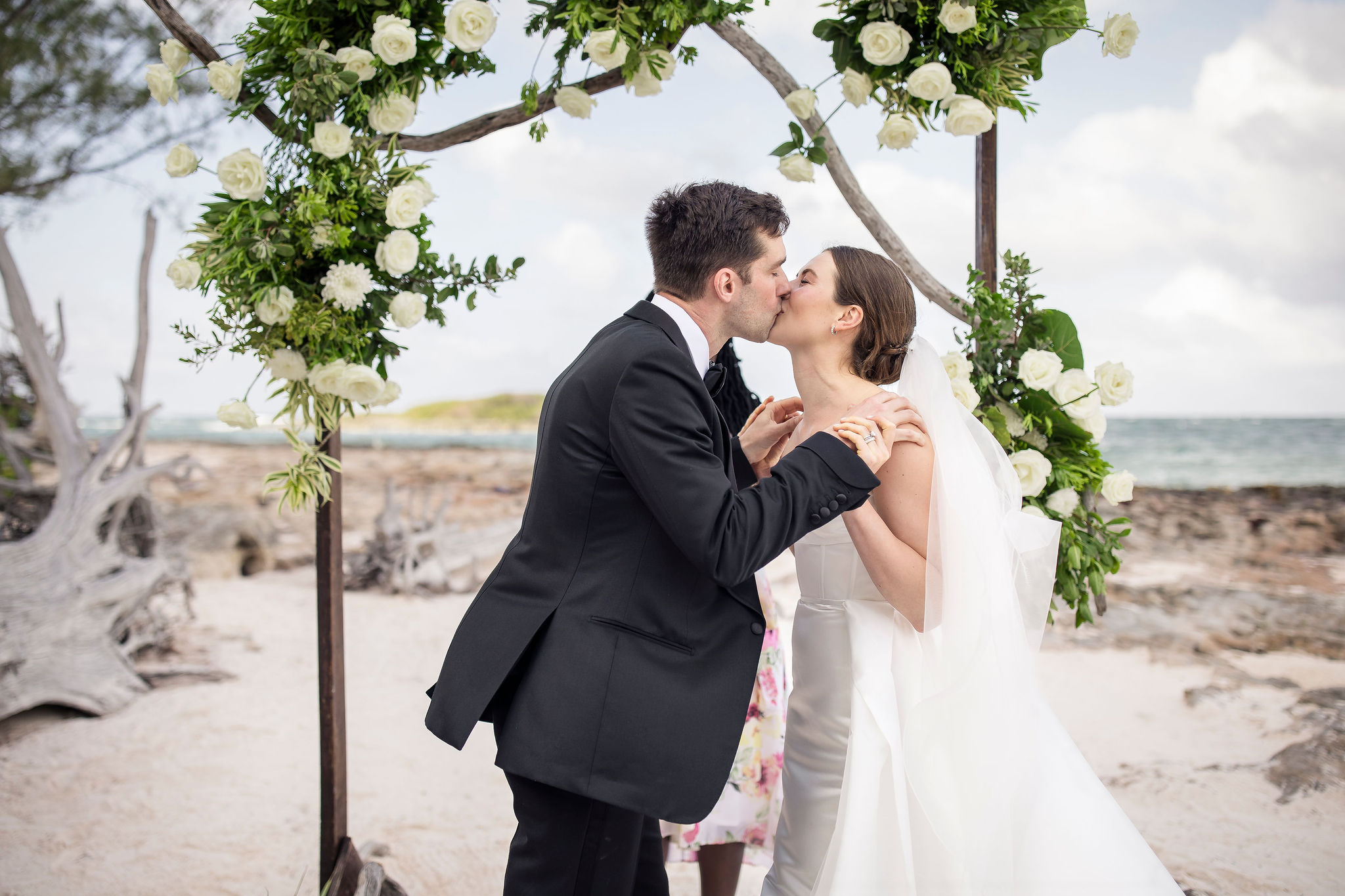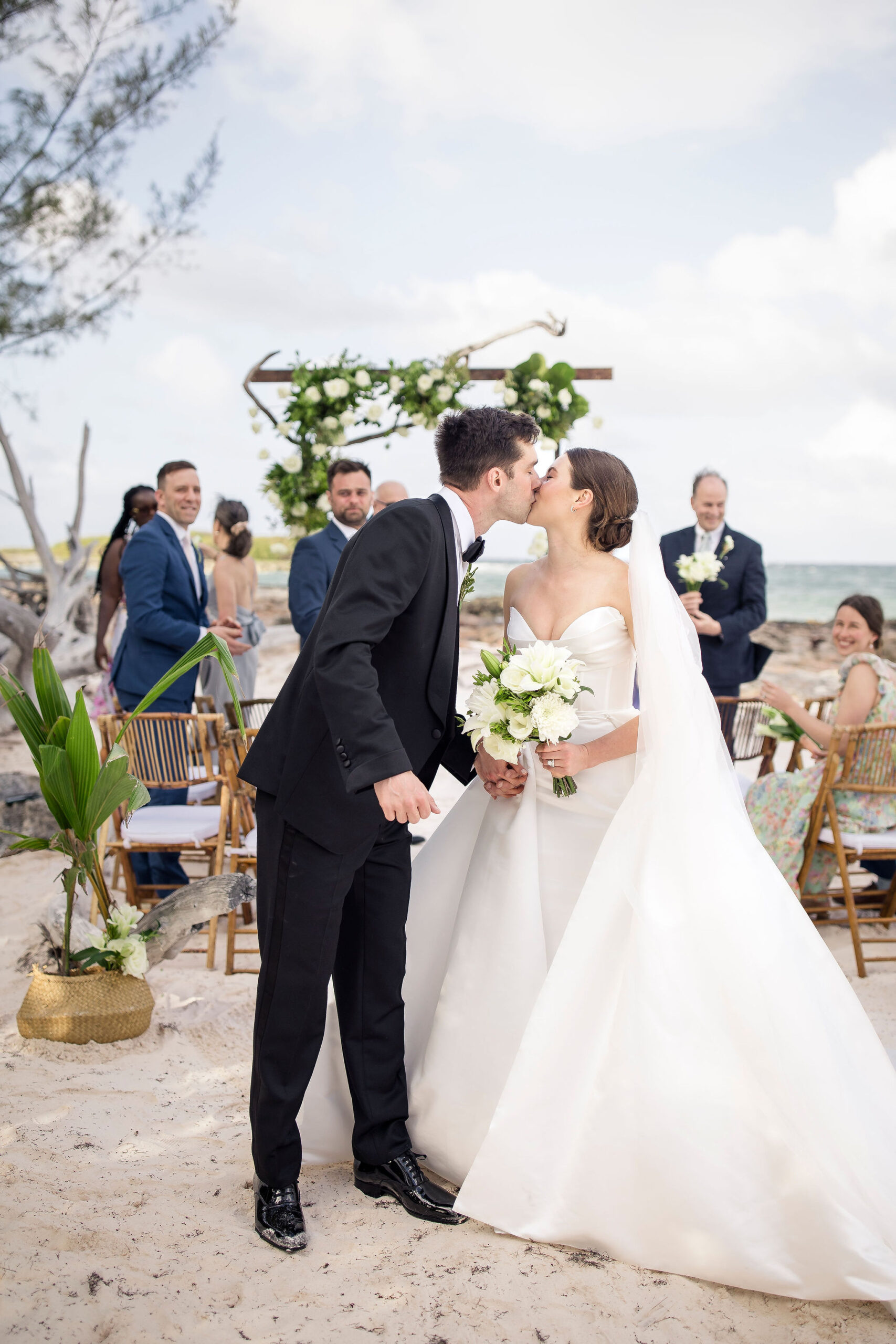 The ceremony took place right on the beach, framed by the turquoise waters that make Eleuthera so special. The décor, beautifully styled by Mish at Boy Meets Girl Weddings, reflected the couple’s style—simple, elegant, and full of island charm. With the waves gently rolling in as the soundtrack, there wasn’t a more perfect backdrop for their vows.